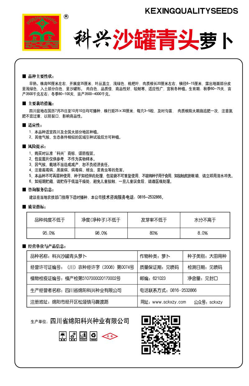 属性:早熟,株高60厘米左右,开展度35厘米,叶丛直立,浅绿色,枇杷叶、肉质根长20厘米左右,横径8-15厘米、露出地面部分皮呈浅绿色,入土部分白色.呈沙罐形。肉白色,品质佳.商品性好,较耐寒,适应性广,宜秋冬种植。生育期:秋季60-75天,亩产3500千克左右: