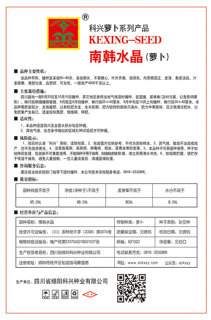 该品种早熟.播种至采收60-80天,采收期长,不易糠心。叶片开展,浅绿色。肉质根圆正,皮薄,表皮洁白。汁多脆嫩,清甜化渣,品质好,可生吃。一般亩产4000千克以上。