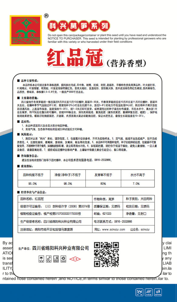 1、购买时认准“科兴”商标,谨防假冒。2、包装图片仅供参考,不作为实物样本。3.因气候、栽培不当造成减产,想不负经济责任。4.注意软腐病、灰需病、菌核病、蚜虫等的危害。5、本品种不可再留种使用、种子如经拌药处理,包装袋不可重复使用,不能将种子用于食用.如接触皮肤眼睛,请立即用清水冲洗。6,如短期贮藏,请贮存于低温干燥处,避免儿童接.一旦儿童误食后.请遵医处理。7、高温季节栽培易抽苔,因此要加强肥水管理,否则会造成产量降低。莴笋不宜连作.连作病虫害严重