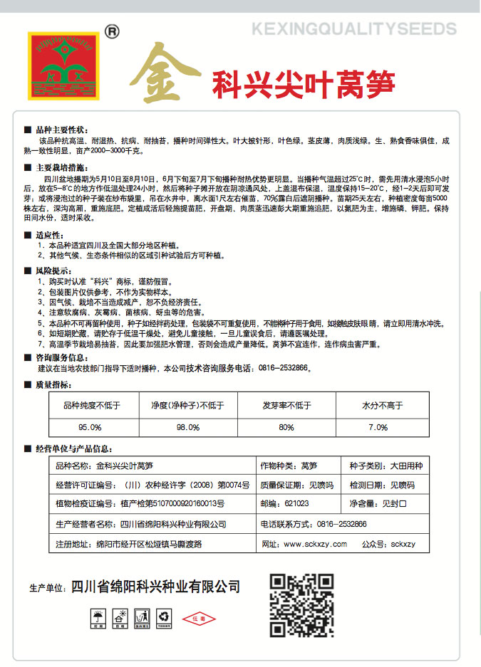 1、购买时认准“科兴”商标,谨防假冒。2、包装图片仅供参考,不作为实物样本。3.因气候、栽培不当造成减产,想不负经济责任。4.注意软腐病、灰需病、菌核病、蚜虫等的危害。5、本品种不可再留种使用、种子如经拌药处理,包装袋不可重复使用,不能将种子用于食用.如接触皮肤眼睛,请立即用清水冲洗。6,如短期贮藏,请贮存于低温干燥处,避免儿童接.一旦儿童误食后.请遵医处理。7、高温季节栽培易抽苔,因此要加强肥水管理,否则会造成产量降低。莴笋不宜连作.连作病虫害严重