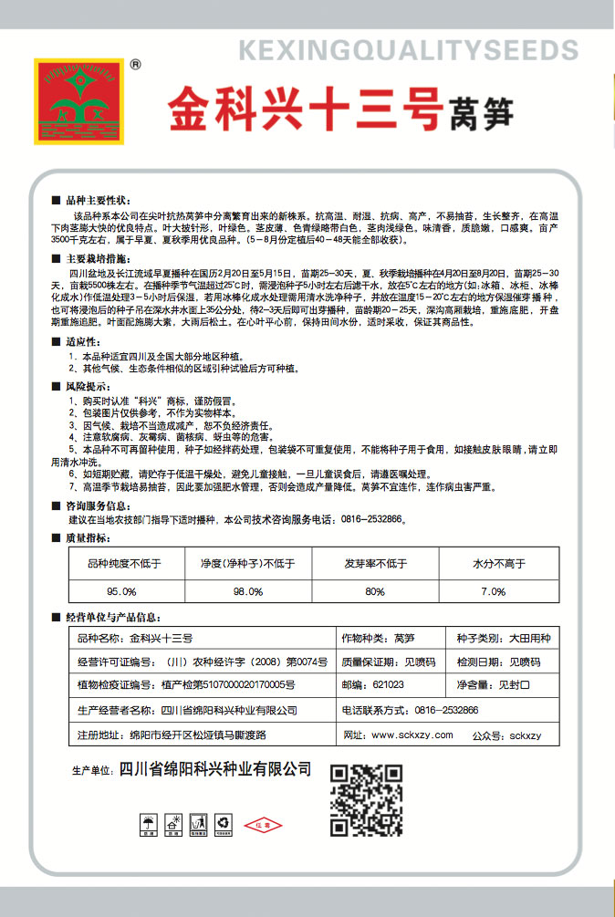 1、购买时认准“科兴”商标,谨防假冒。2、包装图片仅供参考,不作为实物样本。3.因气候、栽培不当造成减产,想不负经济责任。4.注意软腐病、灰需病、菌核病、蚜虫等的危害。5、本品种不可再留种使用、种子如经拌药处理,包装袋不可重复使用,不能将种子用于食用.如接触皮肤眼睛,请立即用清水冲洗。6,如短期贮藏,请贮存于低温干燥处,避免儿童接.一旦儿童误食后.请遵医处理。7、高温季节栽培易抽苔,因此要加强肥水管理,否则会造成产量降低。莴笋不宜连作.连作病虫害严重