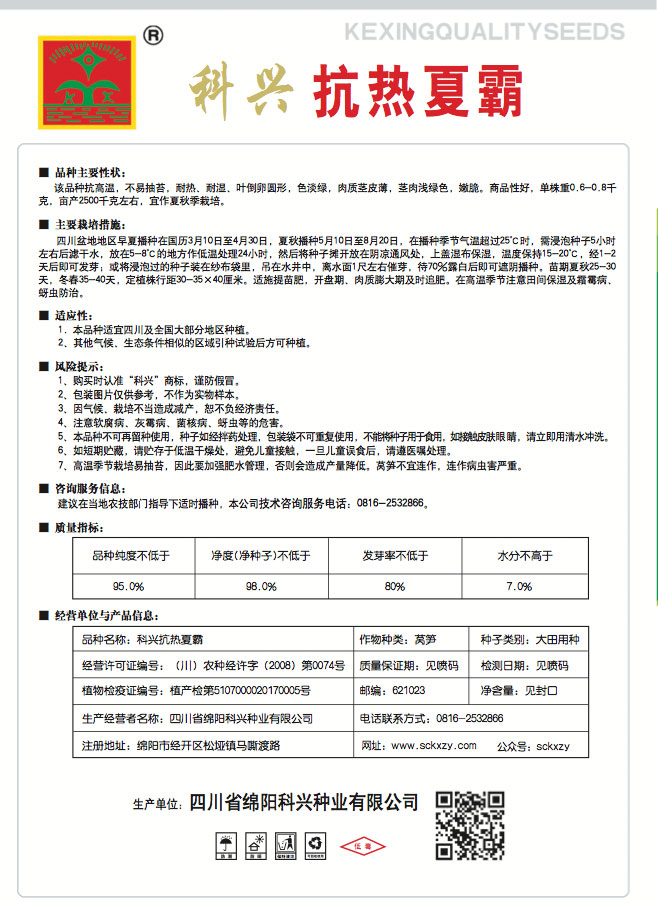 1、购买时认准“科兴”商标,谨防假冒。2、包装图片仅供参考,不作为实物样本。3.因气候、栽培不当造成减产,想不负经济责任。4.注意软腐病、灰需病、菌核病、蚜虫等的危害。5、本品种不可再留种使用、种子如经拌药处理,包装袋不可重复使用,不能将种子用于食用.如接触皮肤眼睛,请立即用清水冲洗。6,如短期贮藏,请贮存于低温干燥处,避免儿童接.一旦儿童误食后.请遵医处理。7、高温季节栽培易抽苔,因此要加强肥水管理,否则会造成产量降低。莴笋不宜连作.连作病虫害严重