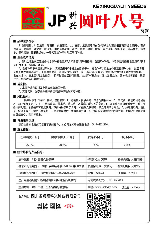 1、购买时认准“科兴”商标,谨防假冒。2、包装图片仅供参考,不作为实物样本。3.因气候、栽培不当造成减产,想不负经济责任。4.注意软腐病、灰需病、菌核病、蚜虫等的危害。5、本品种不可再留种使用、种子如经拌药处理,包装袋不可重复使用,不能将种子用于食用.如接触皮肤眼睛,请立即用清水冲洗。6,如短期贮藏,请贮存于低温干燥处,避免儿童接.一旦儿童误食后.请遵医处理。7、高温季节栽培易抽苔,因此要加强肥水管理,否则会造成产量降低。莴笋不宜连作.连作病虫害严重