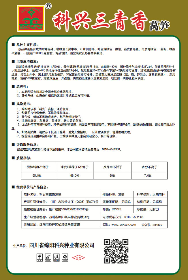 1、购买时认准“科兴”商标,谨防假冒。2、包装图片仅供参考,不作为实物样本。3.因气候、栽培不当造成减产,想不负经济责任。4.注意软腐病、灰需病、菌核病、蚜虫等的危害。5、本品种不可再留种使用、种子如经拌药处理,包装袋不可重复使用,不能将种子用于食用.如接触皮肤眼睛,请立即用清水冲洗。6,如短期贮藏,请贮存于低温干燥处,避免儿童接.一旦儿童误食后.请遵医处理。7、高温季节栽培易抽苔,因此要加强肥水管理,否则会造成产量降低。莴笋不宜连作.连作病虫害严重