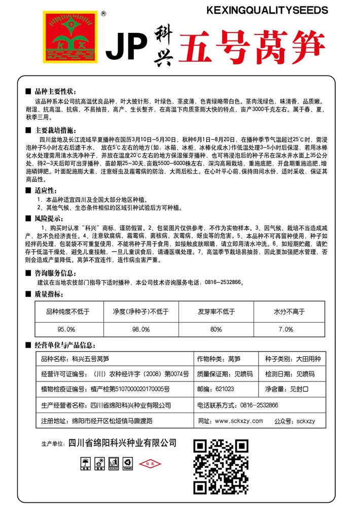 1、购买时认准“科兴”商标,谨防假冒。2、包装图片仅供参考,不作为实物样本。3.因气候、栽培不当造成减产,想不负经济责任。4.注意软腐病、灰需病、菌核病、蚜虫等的危害。5、本品种不可再留种使用、种子如经拌药处理,包装袋不可重复使用,不能将种子用于食用.如接触皮肤眼睛,请立即用清水冲洗。6,如短期贮藏,请贮存于低温干燥处,避免儿童接.一旦儿童误食后.请遵医处理。7、高温季节栽培易抽苔,因此要加强肥水管理,否则会造成产量降低。莴笋不宜连作.连作病虫害严重