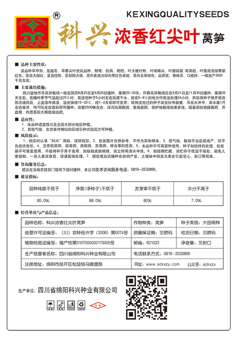 1、购买时认准“科兴”商标,谨防假冒。2、包装图片仅供参考,不作为实物样本。3.因气候、栽培不当造成减产,想不负经济责任。4.注意软腐病、灰需病、菌核病、蚜虫等的危害。5、本品种不可再留种使用、种子如经拌药处理,包装袋不可重复使用,不能将种子用于食用。如接触皮肤眼睛,请立即用清水冲洗。6,如短期贮藏,请贮存于低温干燥处,避免儿童接.一旦儿童误食后.请遵医处理。7、高温季节栽培易抽苔,因此要加强肥水管理,否则会造成产量降低。莴笋不宜连作.连作病虫害严重