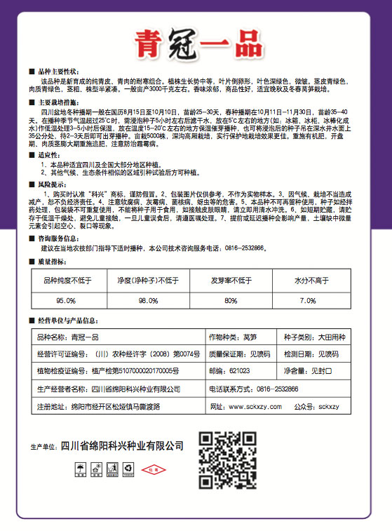 1、购买时认准“科兴”商标,谨防假冒。2、包装图片仅供参考,不作为实物样本。3.因气候、栽培不当造成减产,想不负经济责任。4.注意软腐病、灰需病、菌核病、蚜虫等的危害。5、本品种不可再留种使用、种子如经拌药处理,包装袋不可重复使用,不能将种子用于食用。如接触皮肤眼睛,请立即用清水冲洗。6,如短期贮藏,请贮存于低温干燥处,避免儿童接.一旦儿童误食后.请遵医处理。7、高温季节栽培易抽苔,因此要加强肥水管理,否则会造成产量降低。莴笋不宜连作.连作病虫害严重