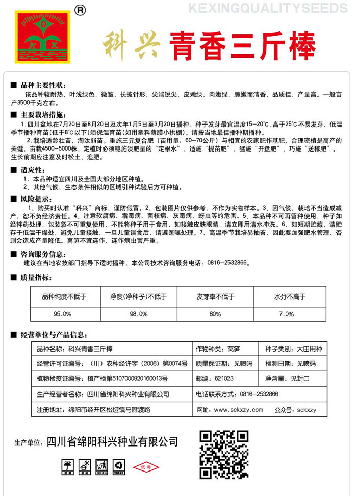1、购买时认准“科兴”商标,谨防假冒。2、包装图片仅供参考,不作为实物样本。3.因气候、栽培不当造成减产,想不负经济责任。4.注意软腐病、灰需病、菌核病、蚜虫等的危害。5、本品种不可再留种使用、种子如经拌药处理,包装袋不可重复使用,不能将种子用于食用。如接触皮肤眼睛,请立即用清水冲洗。6,如短期贮藏,请贮存于低温干燥处,避免儿童接.一旦儿童误食后.请遵医处理。7、高温季节栽培易抽苔,因此要加强肥水管理,否则会造成产量降低。莴笋不宜连作.连作病虫害严重