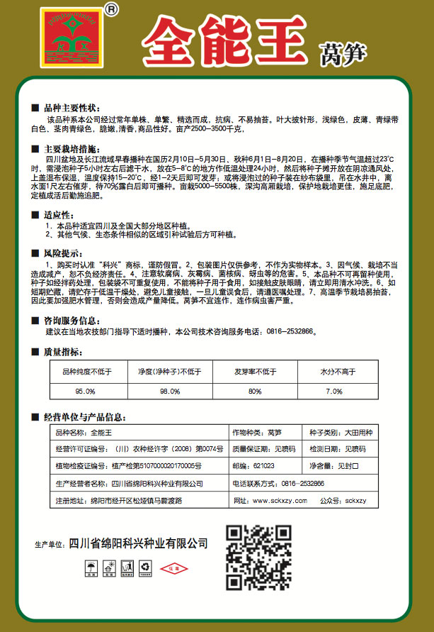 1、购买时认准“科兴”商标,谨防假冒。2、包装图片仅供参考,不作为实物样本。3.因气候、栽培不当造成减产,想不负经济责任。4.注意软腐病、灰需病、菌核病、蚜虫等的危害。5、本品种不可再留种使用、种子如经拌药处理,包装袋不可重复使用,不能将种子用于食用。如接触皮肤眼睛,请立即用清水冲洗。6,如短期贮藏,请贮存于低温干燥处,避免儿童接.一旦儿童误食后.请遵医处理。7、高温季节栽培易抽苔,因此要加强肥水管理,否则会造成产量降低。莴笋不宜连作.连作病虫害严重