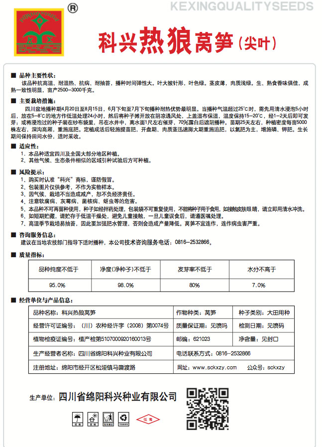1、购买时认准“科兴”商标,谨防假冒。2、包装图片仅供参考,不作为实物样本。3.因气候、栽培不当造成减产,想不负经济责任。4.注意软腐病、灰需病、菌核病、蚜虫等的危害。5、本品种不可再留种使用、种子如经拌药处理,包装袋不可重复使用,不能将种子用于食用。如接触皮肤眼睛,请立即用清水冲洗。6,如短期贮藏,请贮存于低温干燥处,避免儿童接.一旦儿童误食后.请遵医处理。7、高温季节栽培易抽苔,因此要加强肥水管理,否则会造成产量降低。莴笋不宜连作.连作病虫害严重