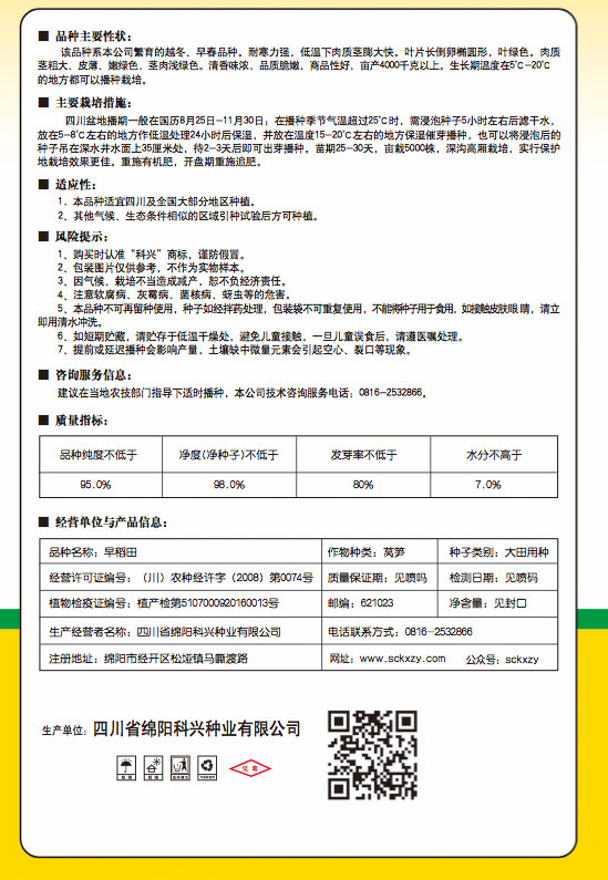 1、购买时认准“科兴”商标,谨防假冒。2、包装图片仅供参考,不作为实物样本。3.因气候、栽培不当造成减产,想不负经济责任。4.注意软腐病、灰需病、菌核病、蚜虫等的危害。5、本品种不可再留种使用、种子如经拌药处理,包装袋不可重复使用,不能将种子用于食用。如接触皮肤眼睛,请立即用清水冲洗。6,如短期贮藏,请贮存于低温干燥处,避免儿童接.一旦儿童误食后.请遵医处理。7、高温季节栽培易抽苔,因此要加强肥水管理,否则会造成产量降低。莴笋不宜连作.连作病虫害严重