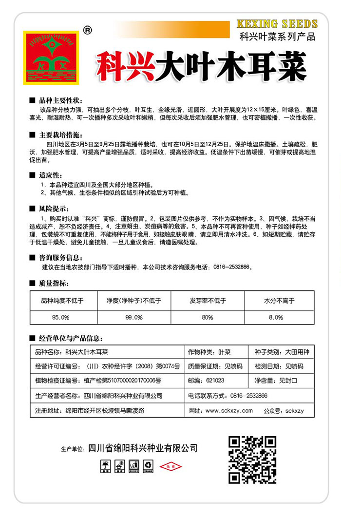 1、购买时认准“科兴”商标,谨防假冒。2、包装图片仅供参考,不作为实物样本。3.因气候、栽培不当造成减产,想不负经济责任。4.注意软腐病、灰需病、菌核病、蚜虫等的危害。5、本品种不可再留种使用、种子如经拌药处理,包装袋不可重复使用,不能将种子用于食用。如接触皮肤眼睛,请立即用清水冲洗。6,如短期贮藏,请贮存于低温干燥处,避免儿童接.一旦儿童误食后.请遵医处理。7、高温季节栽培易抽苔,因此要加强肥水管理,否则会造成产量降低。