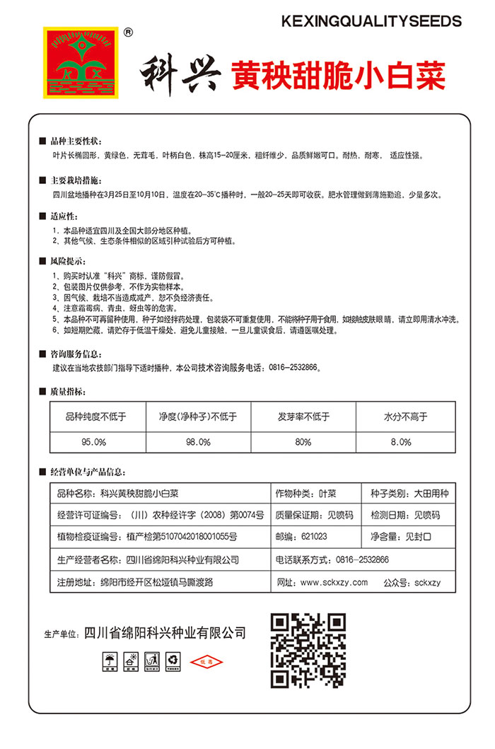 1、购买时认准“科兴”商标,谨防假冒。2、包装图片仅供参考,不作为实物样本。3.因气候、栽培不当造成减产,想不负经济责任。4.注意软腐病、灰需病、菌核病、蚜虫等的危害。5、本品种不可再留种使用、种子如经拌药处理,包装袋不可重复使用,不能将种子用于食用。如接触皮肤眼睛,请立即用清水冲洗。6,如短期贮藏,请贮存于低温干燥处,避免儿童接.一旦儿童误食后.请遵医处理。7、高温季节栽培易抽苔,因此要加强肥水管理,否则会造成产量降低。