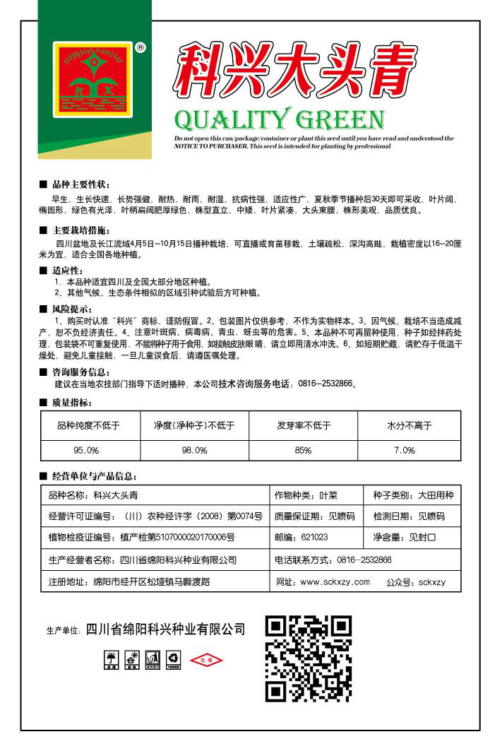 1、购买时认准“科兴”商标,谨防假冒。2、包装图片仅供参考,不作为实物样本。3.因气候、栽培不当造成减产,想不负经济责任。4.注意软腐病、灰需病、菌核病、蚜虫等的危害。5、本品种不可再留种使用、种子如经拌药处理,包装袋不可重复使用,不能将种子用于食用。如接触皮肤眼睛,请立即用清水冲洗。6,如短期贮藏,请贮存于低温干燥处,避免儿童接.一旦儿童误食后.请遵医处理。7、高温季节栽培易抽苔,因此要加强肥水管理,否则会造成产量降低。