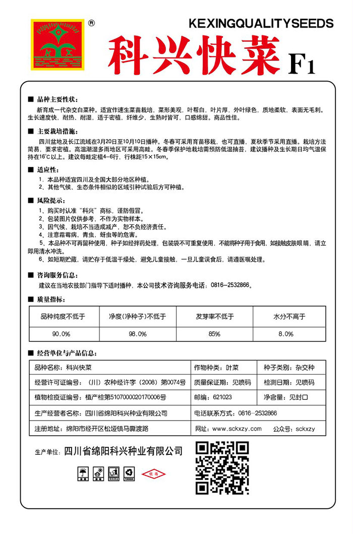 1、购买时认准“科兴”商标,谨防假冒。2、包装图片仅供参考,不作为实物样本。3.因气候、栽培不当造成减产,想不负经济责任。4.注意软腐病、灰需病、菌核病、蚜虫等的危害。5、本品种不可再留种使用、种子如经拌药处理,包装袋不可重复使用,不能将种子用于食用。如接触皮肤眼睛,请立即用清水冲洗。6,如短期贮藏,请贮存于低温干燥处,避免儿童接.一旦儿童误食后.请遵医处理。7、高温季节栽培易抽苔,因此要加强肥水管理,否则会造成产量降低。