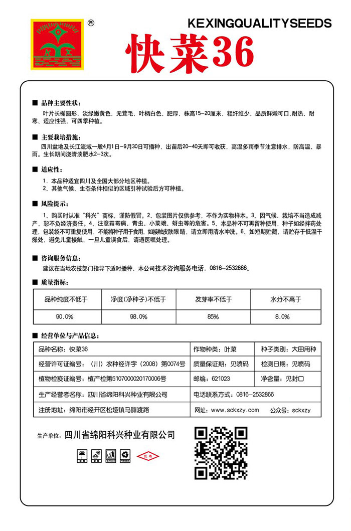 1、购买时认准“科兴”商标,谨防假冒。2、包装图片仅供参考,不作为实物样本。3.因气候、栽培不当造成减产,想不负经济责任。4.注意软腐病、灰需病、菌核病、蚜虫等的危害。5、本品种不可再留种使用、种子如经拌药处理,包装袋不可重复使用,不能将种子用于食用。如接触皮肤眼睛,请立即用清水冲洗。6,如短期贮藏,请贮存于低温干燥处,避免儿童接.一旦儿童误食后.请遵医处理。7、高温季节栽培易抽苔,因此要加强肥水管理,否则会造成产量降低。