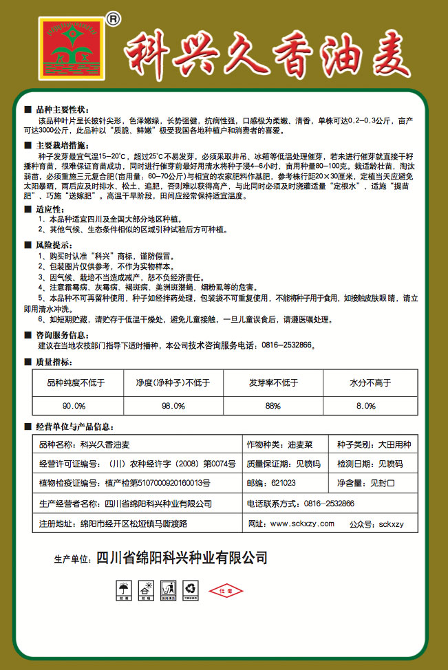 1、购买时认准“科兴”商标,谨防假冒。2、包装图片仅供参考,不作为实物样本。3.因气候、栽培不当造成减产,想不负经济责任。4.注意软腐病、灰需病、菌核病、蚜虫等的危害。5、本品种不可再留种使用、种子如经拌药处理,包装袋不可重复使用,不能将种子用于食用。如接触皮肤眼睛,请立即用清水冲洗。6,如短期贮藏,请贮存于低温干燥处,避免儿童接.一旦儿童误食后.请遵医处理。7、高温季节栽培易抽苔,因此要加强肥水管理,否则会造成产量降低。