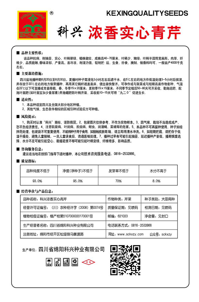 1、购买时认准“科兴”商标,谨防假冒。2、包装图片仅供参考,不作为实物样本。3.因气候、栽培不当造成减产,想不负经济责任。4.注意软腐病、灰需病、菌核病、蚜虫等的危害。5、本品种不可再留种使用、种子如经拌药处理,包装袋不可重复使用,不能将种子用于食用。如接触皮肤眼睛,请立即用清水冲洗。6,如短期贮藏,请贮存于低温干燥处,避免儿童接.一旦儿童误食后.请遵医处理。7、高温季节栽培易抽苔,因此要加强肥水管理,否则会造成产量降低。