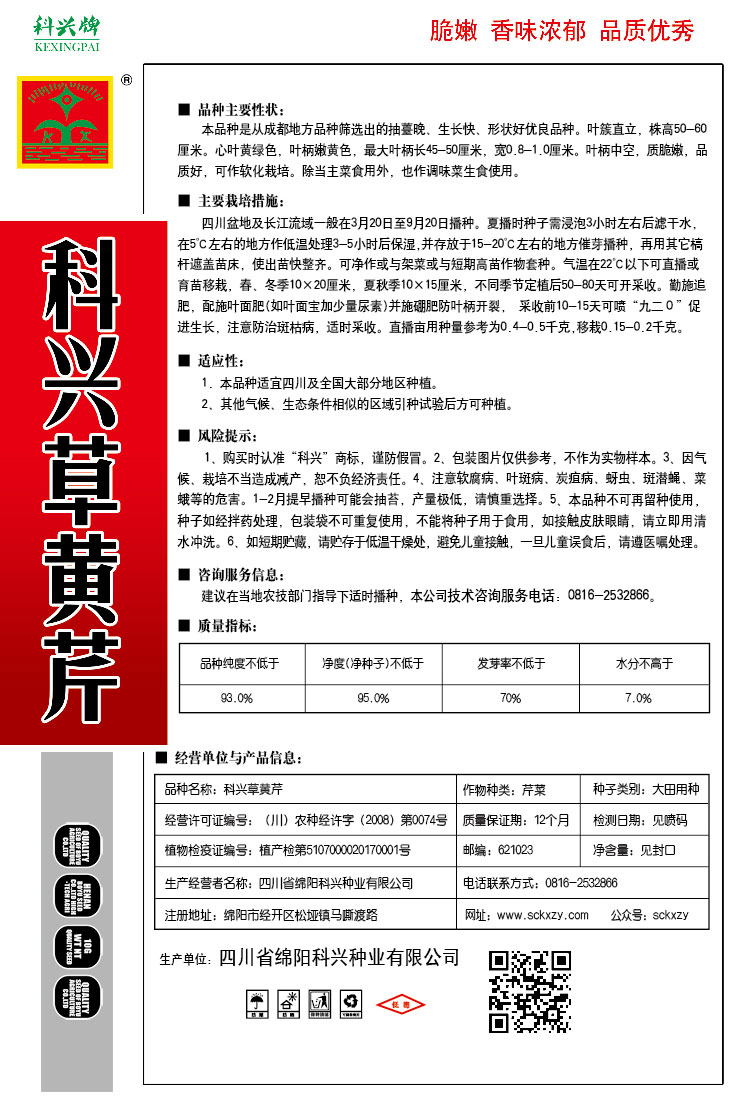 1、购买时认准“科兴”商标,谨防假冒。2、包装图片仅供参考,不作为实物样本。3.因气候、栽培不当造成减产,想不负经济责任。4.注意软腐病、灰需病、菌核病、蚜虫等的危害。5、本品种不可再留种使用、种子如经拌药处理,包装袋不可重复使用,不能将种子用于食用。如接触皮肤眼睛,请立即用清水冲洗。6,如短期贮藏,请贮存于低温干燥处,避免儿童接.一旦儿童误食后.请遵医处理。7、高温季节栽培易抽苔,因此要加强肥水管理,否则会造成产量降低。