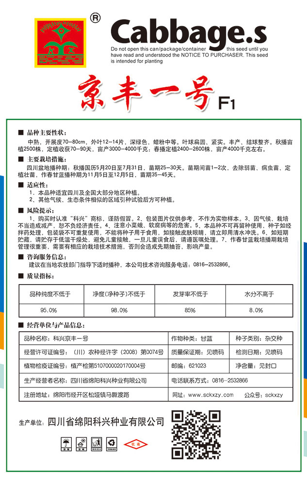 1、购买时认准“科兴”商标,谨防假冒。2、包装图片仅供参考,不作为实物样本。3.因气候、栽培不当造成减产,想不负经济责任。4.注意软腐病、灰需病、菌核病、蚜虫等的危害。5、本品种不可再留种使用、种子如经拌药处理,包装袋不可重复使用,不能将种子用于食用。如接触皮肤眼睛,请立即用清水冲洗。6,如短期贮藏,请贮存于低温干燥处,避免儿童接.一旦儿童误食后.请遵医处理。7、高温季节栽培易抽苔,因此要加强肥水管理,否则会造成产量降低。