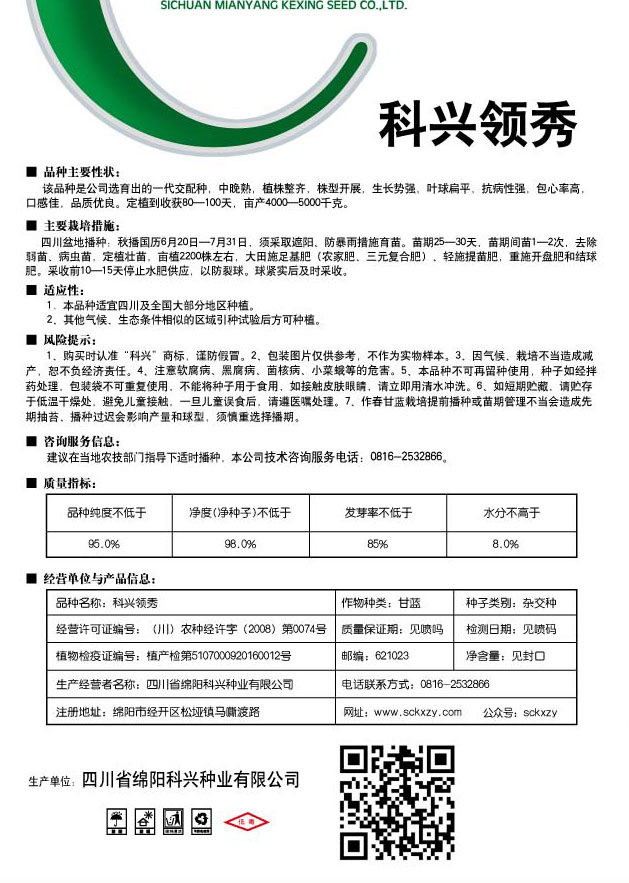 1、购买时认准“科兴”商标,谨防假冒。2、包装图片仅供参考,不作为实物样本。3.因气候、栽培不当造成减产,想不负经济责任。4.注意软腐病、灰需病、菌核病、蚜虫等的危害。5、本品种不可再留种使用、种子如经拌药处理,包装袋不可重复使用,不能将种子用于食用。如接触皮肤眼睛,请立即用清水冲洗。6,如短期贮藏,请贮存于低温干燥处,避免儿童接.一旦儿童误食后.请遵医处理。7、高温季节栽培易抽苔,因此要加强肥水管理,否则会造成产量降低。