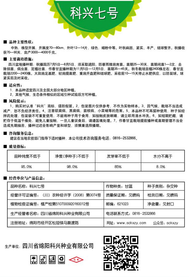 1、购买时认准“科兴”商标,谨防假冒。2、包装图片仅供参考,不作为实物样本。3.因气候、栽培不当造成减产,想不负经济责任。4.注意软腐病、灰需病、菌核病、蚜虫等的危害。5、本品种不可再留种使用、种子如经拌药处理,包装袋不可重复使用,不能将种子用于食用。如接触皮肤眼睛,请立即用清水冲洗。6,如短期贮藏,请贮存于低温干燥处,避免儿童接.一旦儿童误食后.请遵医处理。7、高温季节栽培易抽苔,因此要加强肥水管理,否则会造成产量降低。