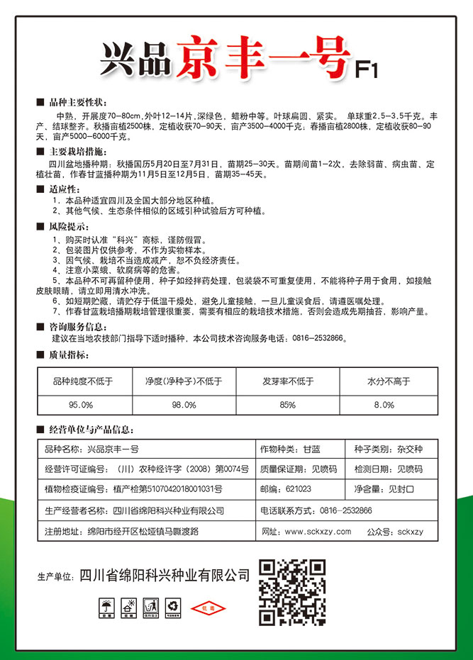 1、购买时认准“科兴”商标,谨防假冒。2、包装图片仅供参考,不作为实物样本。3.因气候、栽培不当造成减产,想不负经济责任。4.注意软腐病、灰需病、菌核病、蚜虫等的危害。5、本品种不可再留种使用、种子如经拌药处理,包装袋不可重复使用,不能将种子用于食用。如接触皮肤眼睛,请立即用清水冲洗。6,如短期贮藏,请贮存于低温干燥处,避免儿童接.一旦儿童误食后.请遵医处理。7、高温季节栽培易抽苔,因此要加强肥水管理,否则会造成产量降低。