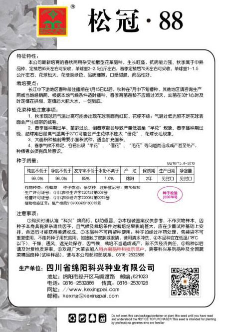 1、购买时认准“科兴”商标,谨防假冒。2、包装图片仅供参考,不作为实物样本。3.因气候、栽培不当造成减产,想不负经济责任。4.注意软腐病、灰需病、菌核病、蚜虫等的危害。5、本品种不可再留种使用、种子如经拌药处理,包装袋不可重复使用,不能将种子用于食用。如接触皮肤眼睛,请立即用清水冲洗。6,如短期贮藏,请贮存于低温干燥处,避免儿童接.一旦儿童误食后.请遵医处理。7、高温季节栽培易抽苔,因此要加强肥水管理,否则会造成产量降低。