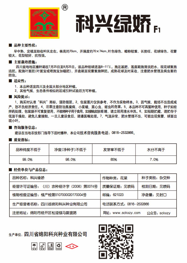 1、购买时认准“科兴”商标,谨防假冒。2、包装图片仅供参考,不作为实物样本。3.因气候、栽培不当造成减产,想不负经济责任。4.注意软腐病、灰需病、菌核病、蚜虫等的危害。5、本品种不可再留种使用、种子如经拌药处理,包装袋不可重复使用,不能将种子用于食用。如接触皮肤眼睛,请立即用清水冲洗。6,如短期贮藏,请贮存于低温干燥处,避免儿童接.一旦儿童误食后.请遵医处理。7、高温季节栽培易抽苔,因此要加强肥水管理,否则会造成产量降低。
