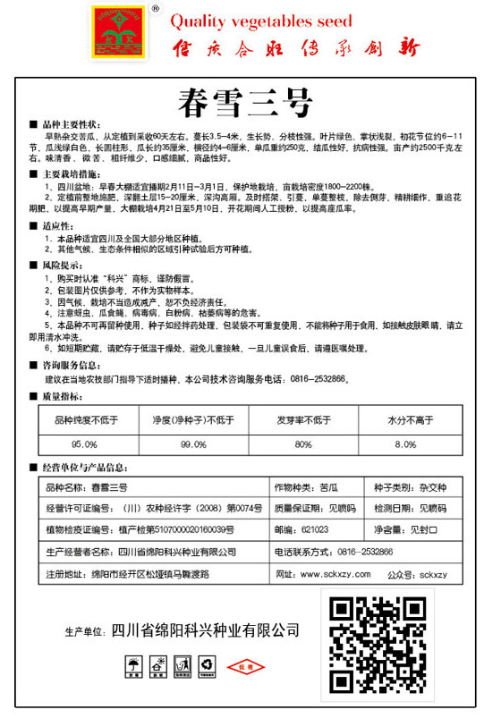 1、购买时认准“科兴”商标,谨防假冒。2、包装图片仅供参考,不作为实物样本。3.因气候、栽培不当造成减产,想不负经济责任。4.注意软腐病、灰需病、菌核病、蚜虫等的危害。5、本品种不可再留种使用、种子如经拌药处理,包装袋不可重复使用,不能将种子用于食用。如接触皮肤眼睛,请立即用清水冲洗。6,如短期贮藏,请贮存于低温干燥处,避免儿童接.一旦儿童误食后.请遵医处理。7、高温季节栽培易抽苔,因此要加强肥水管理,否则会造成产量降低。