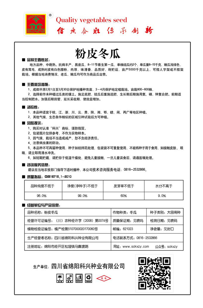 1、购买时认准“科兴”商标,谨防假冒。2、包装图片仅供参考,不作为实物样本。3.因气候、栽培不当造成减产,想不负经济责任。4.注意软腐病、灰需病、菌核病、蚜虫等的危害。5、本品种不可再留种使用、种子如经拌药处理,包装袋不可重复使用,不能将种子用于食用。如接触皮肤眼睛,请立即用清水冲洗。6,如短期贮藏,请贮存于低温干燥处,避免儿童接.一旦儿童误食后.请遵医处理。7、高温季节栽培易抽苔,因此要加强肥水管理,否则会造成产量降低。