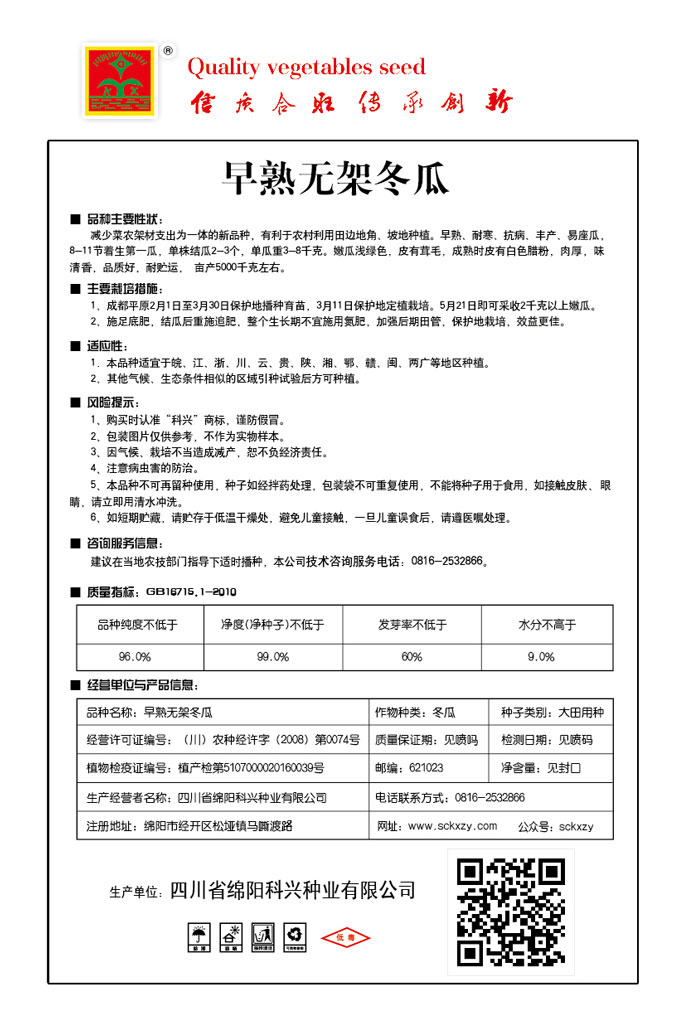 1、购买时认准“科兴”商标,谨防假冒。2、包装图片仅供参考,不作为实物样本。3.因气候、栽培不当造成减产,想不负经济责任。4.注意软腐病、灰需病、菌核病、蚜虫等的危害。5、本品种不可再留种使用、种子如经拌药处理,包装袋不可重复使用,不能将种子用于食用。如接触皮肤眼睛,请立即用清水冲洗。6,如短期贮藏,请贮存于低温干燥处,避免儿童接.一旦儿童误食后.请遵医处理。7、高温季节栽培易抽苔,因此要加强肥水管理,否则会造成产量降低。