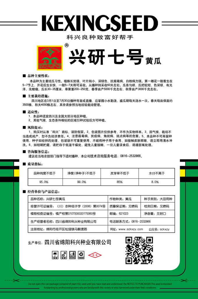 1、购买时认准“科兴”商标,谨防假冒。2、包装图片仅供参考,不作为实物样本。3.因气候、栽培不当造成减产,想不负经济责任。4.注意软腐病、灰需病、菌核病、蚜虫等的危害。5、本品种不可再留种使用、种子如经拌药处理,包装袋不可重复使用,不能将种子用于食用。如接触皮肤眼睛,请立即用清水冲洗。6,如短期贮藏,请贮存于低温干燥处,避免儿童接.一旦儿童误食后.请遵医处理。7、高温季节栽培易抽苔,因此要加强肥水管理,否则会造成产量降低。